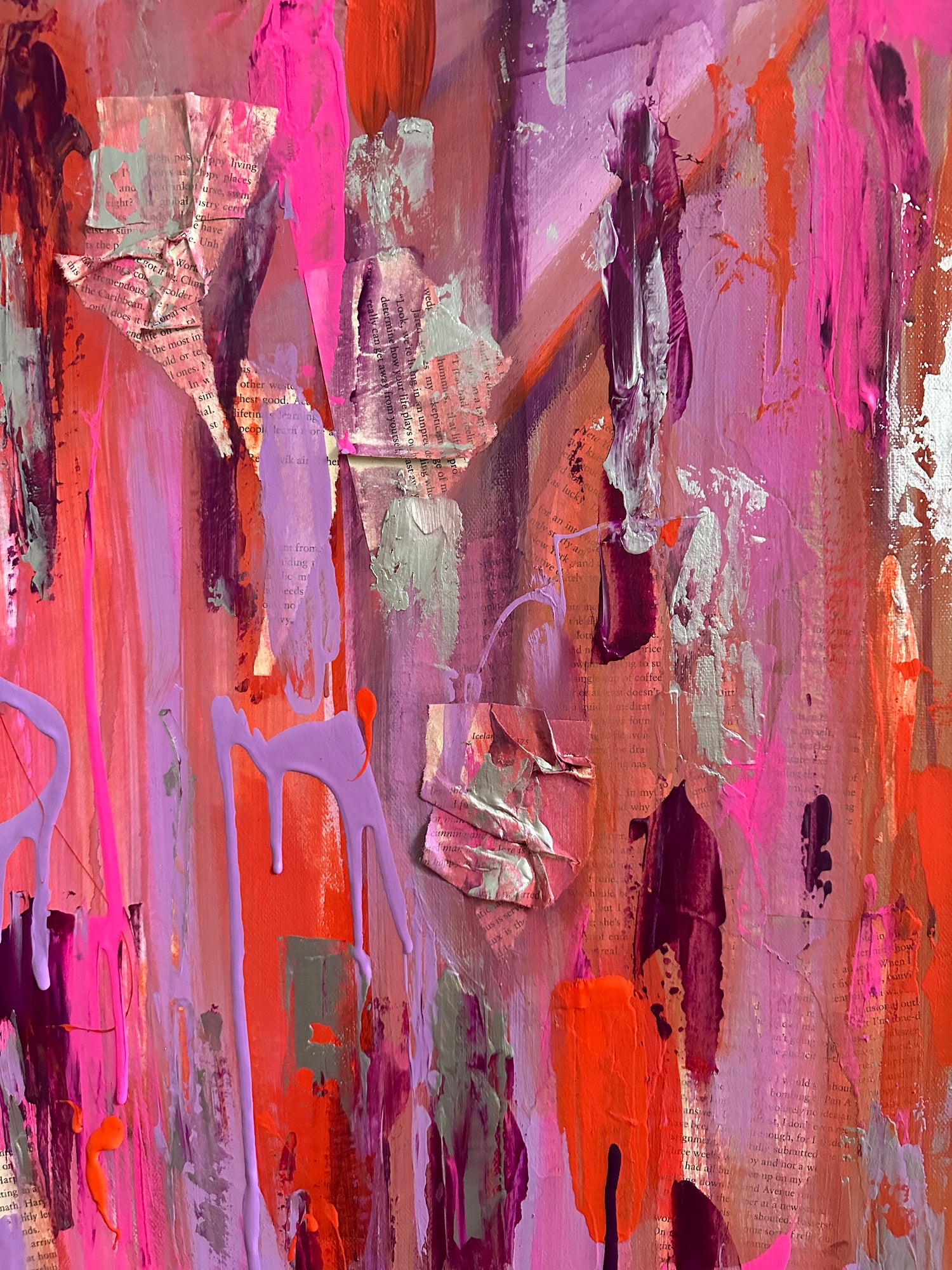 This painting features vibrant pink, orange and purple shades. It is called The Hidden Gem because the acrylic hides a female nude under the different shades of colors and book pages.