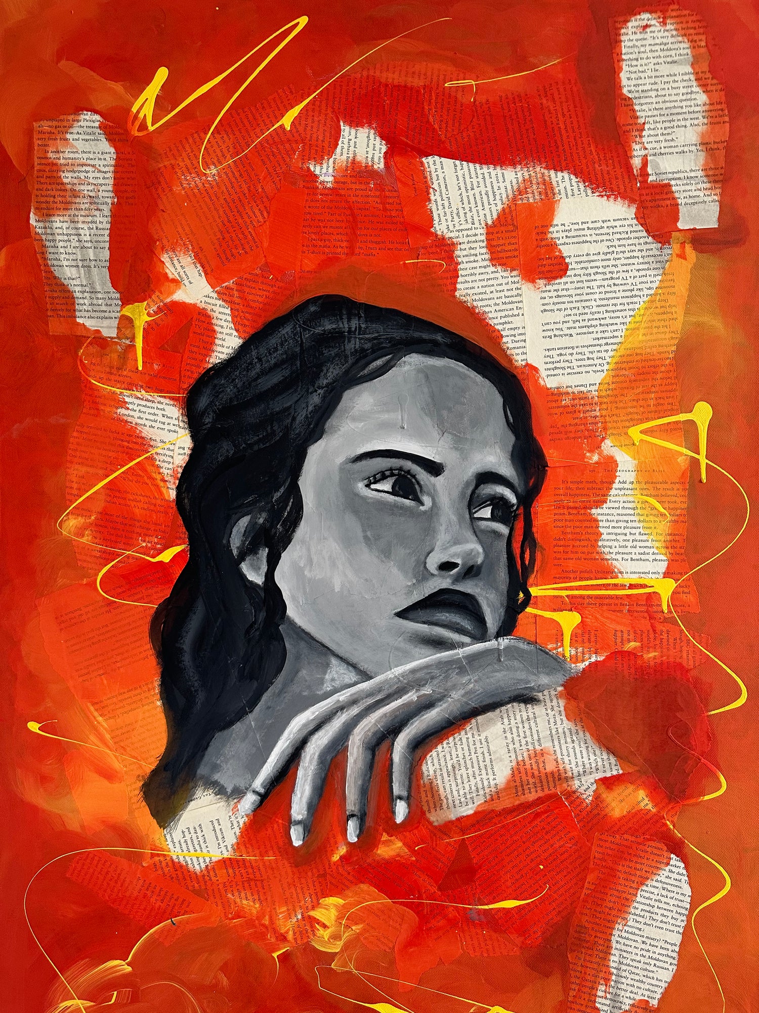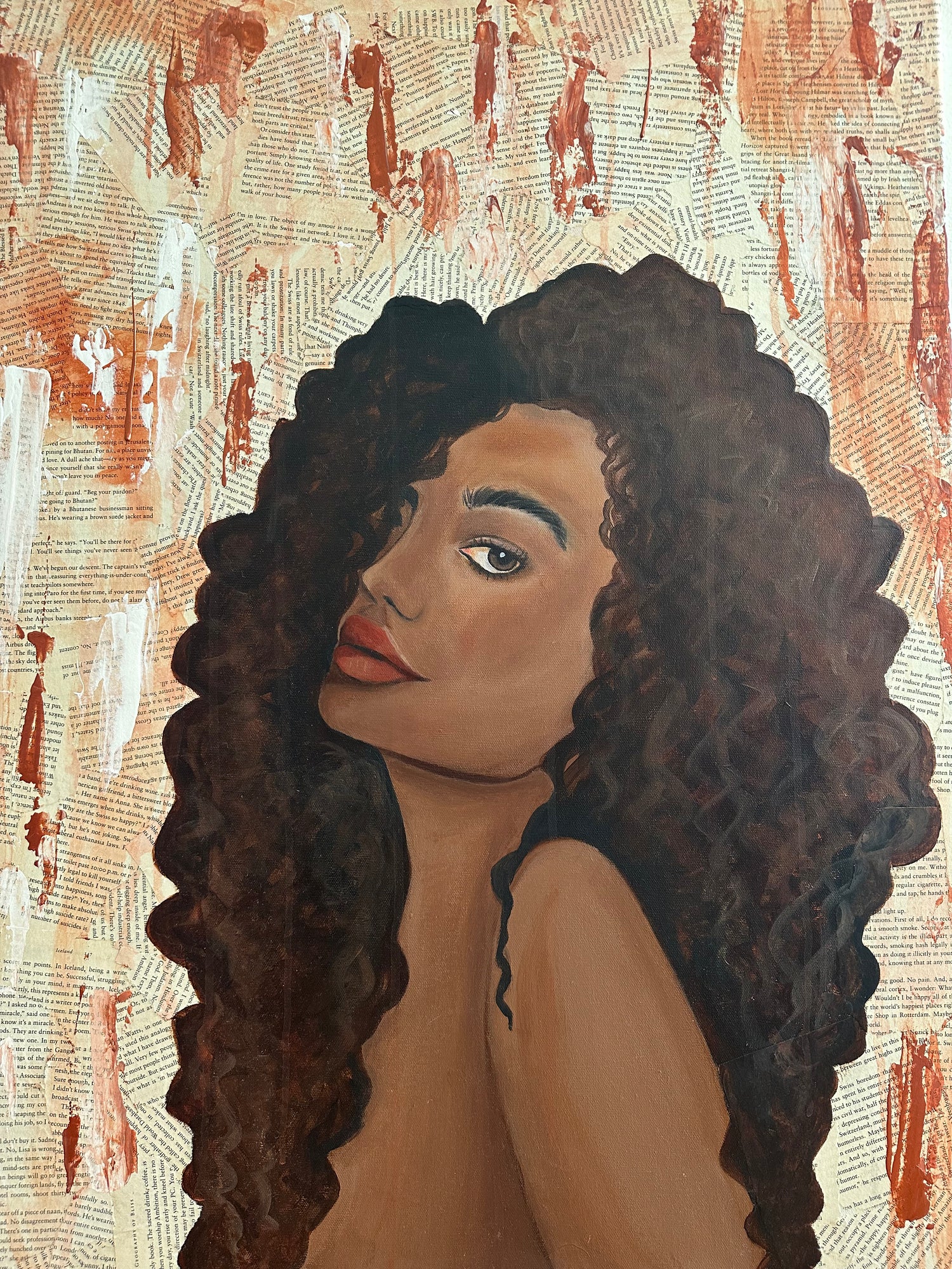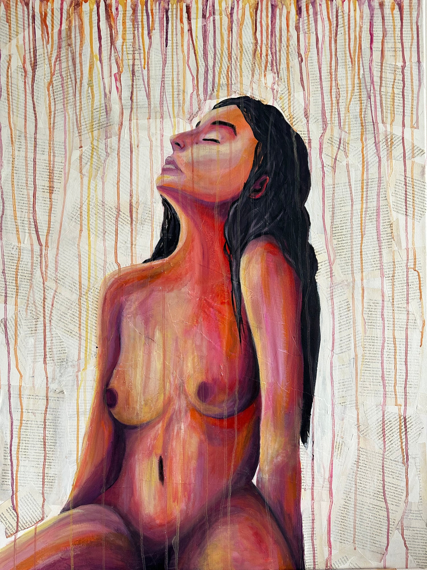 This acrylic painting over pages of the book " The Geography of Bliss " by Eric Weiner is a representation of the female nude under the rain. The colors used are bright orange and pink.