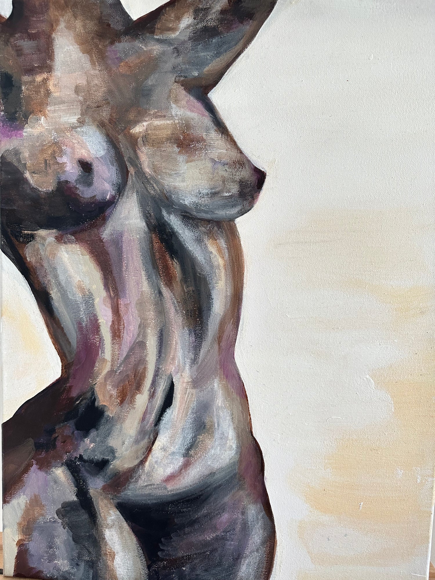 Acrylic painting with shades of grey and brown and purple.